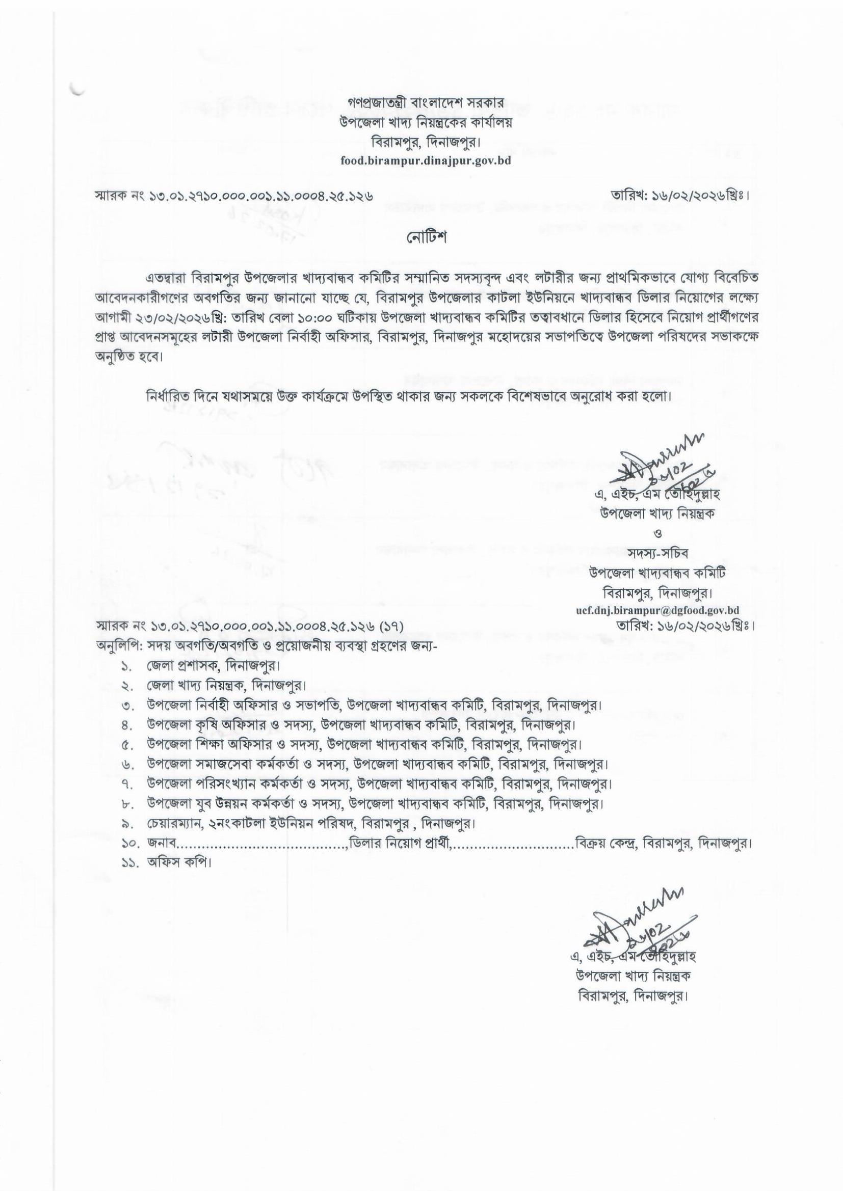 কাটলা ইউনিয়নের খাদ্যবান্ধব ডিলার নিয়োগের লক্ষ্যে লটারীর পুনঃ নোটিশ